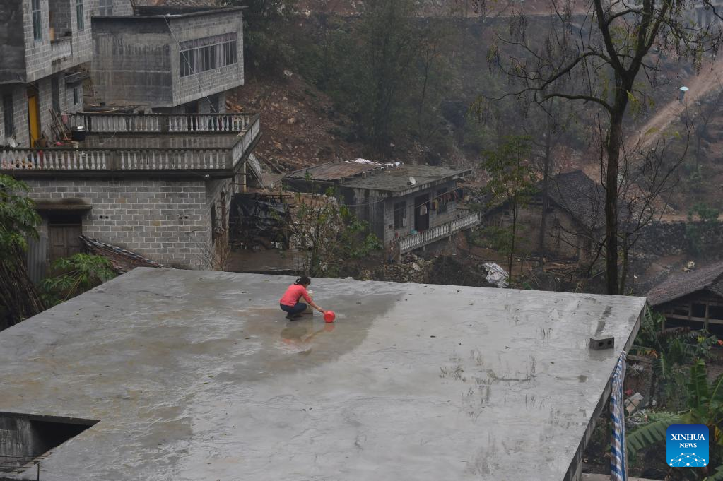 This photo taken on Feb. 12, 2015 shows a villager collecting rainwater on rooftop after a heavy rainfall in Nongyong Village of Bansheng Township, Dahua Yao Autonomous County, south China's Guangxi Zhuang Autonomous Region. (Xinhua/Huang Xiaobang)