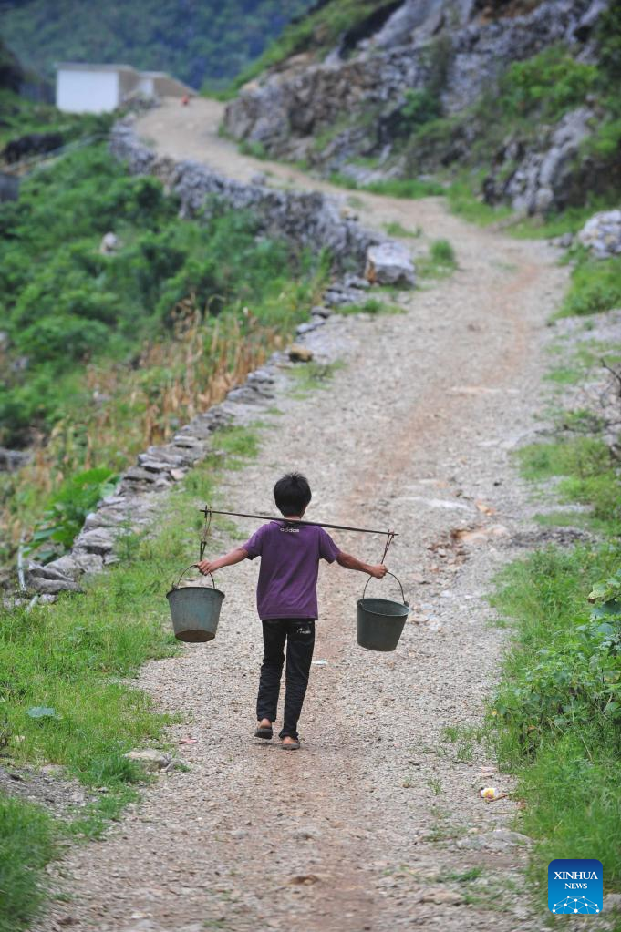 This photo taken on July 16, 2012 shows a villager go uphill to carry water in Nongyong Village of Bansheng Township, Dahua Yao Autonomous County, south China's Guangxi Zhuang Autonomous Region. (Xinhua/Huang Xiaobang)