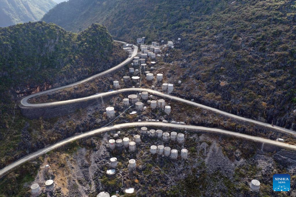 This aerial photo taken on Feb. 6, 2021 shows household water tanks in Shanghe Village of Jiangnan Township, Dahua Yao Autonomous County, south China's Guangxi Zhuang Autonomous Region. (Xinhua/Huang Xiaobang)