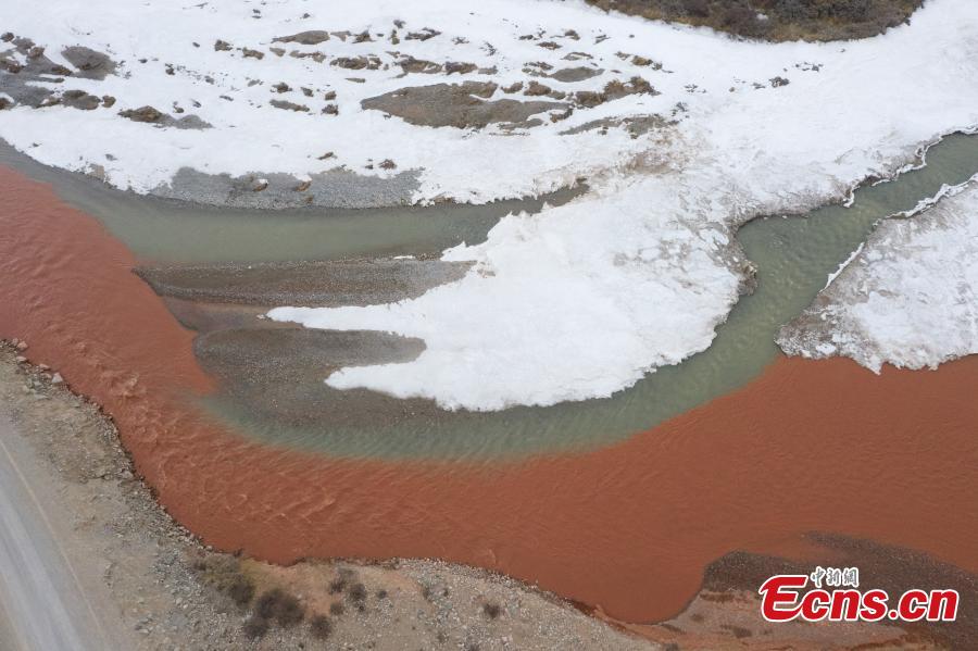 Aerial view shows two rivers meet at the confluence of Hongshui River with two colors at Dulan County, Haixi Mongolian Tibetan Autonomous Prefecture, northwest China's Qinghai Province, March 20, 2023. (Photo: China News Service/Ma Mingyan)