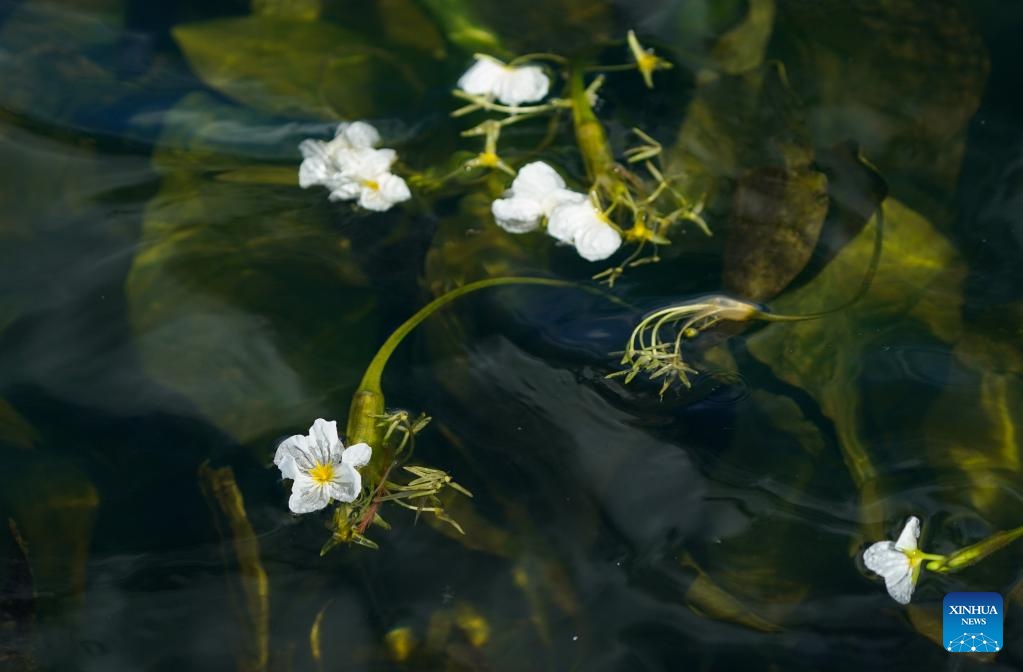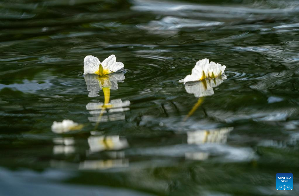 This photo taken on March 21, 2023 shows a view of the blooming ottelia acuminata in Dianchi Lake in Kunming, southwest China's Yunnan Province. Ottelia acuminata, as an indicator species of the environment, exists in fresh water. (Xinhua/Chen Xinbo)