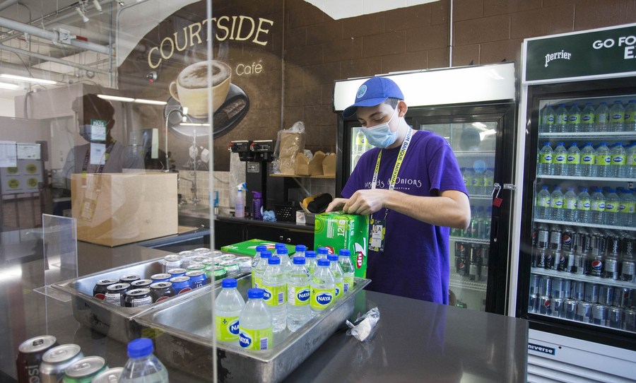 An employee wearing a face mask works at a restaurant at the Aviva Centre during the 2021 National Bank Open in Toronto, Canada, on Aug. 15, 2021. (Photo by Zou Zheng/Xinhua)