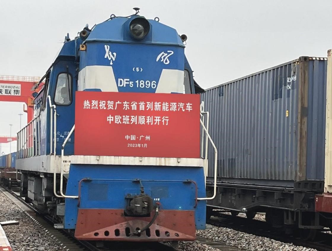 A freight train carrying China-manufactured new energy vehicles departs from Guangzhou for Moscow, Jan. 12, 2023. (Photo courtesy of the State-owned Assets Supervision and Administration Commission of Guangdong Province)