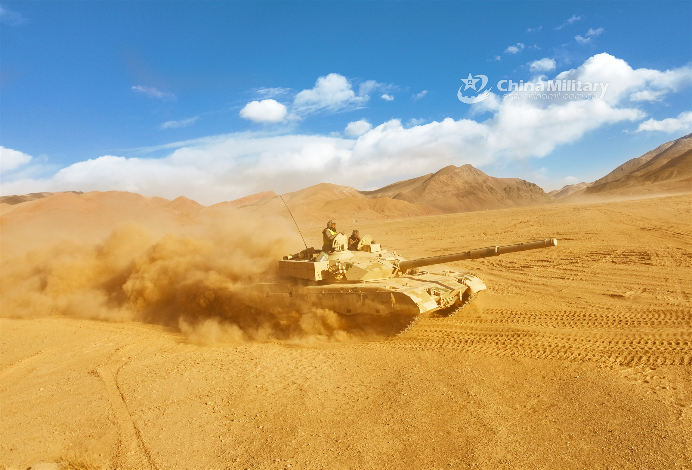 A main battle tank attached to a tank element under the PLA 77th Group Army rumbles through a mound of dust en route to a designated field during a field training exercise in northwest China's Gobi desert in mid March, 2023. (eng.chinamil.com.cn/Photo by Xue Zongyan and Liu Shanlin)