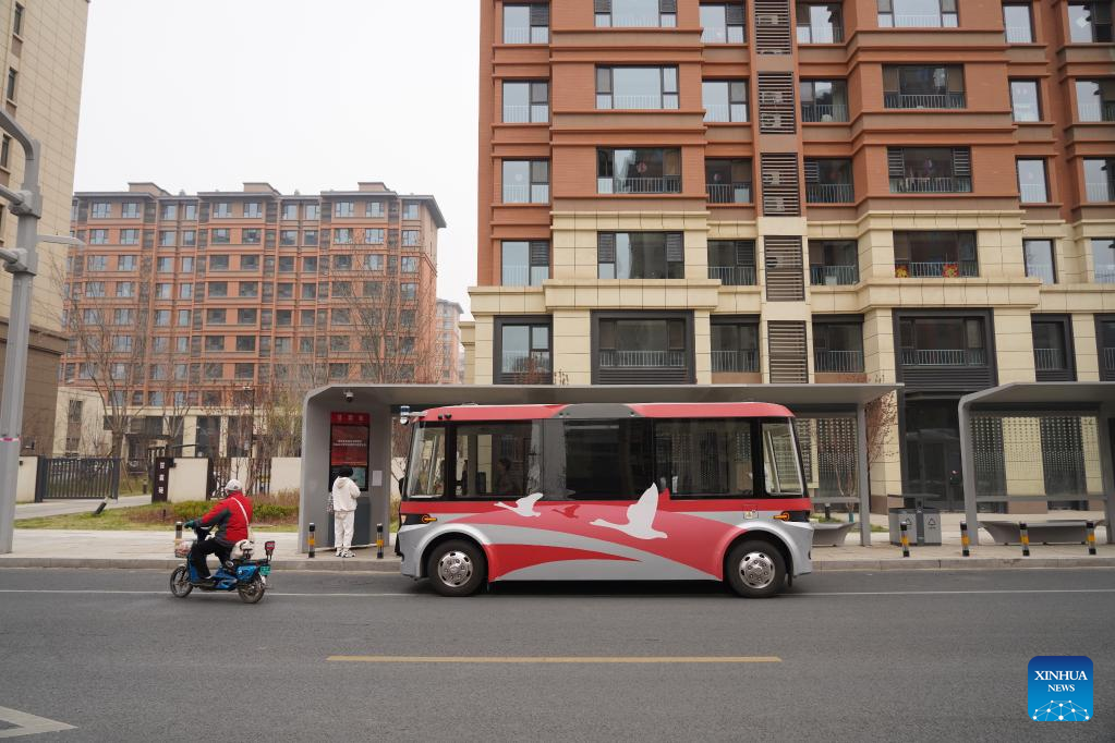 An intelligent connected bus approaches a stop during a trial operation on a street in Rongdong area of Xiong'an New Area, north China's Hebei Province, March 20, 2023. This self-driving passenger bus is equipped with high-precision sensors including laser radars, millimeter-wave radars, and HD cameras, and capable of making operational decisions in one tenth seconds. It can also cope with adverse weather conditions and complicate traffic situations. (Xinhua/Mu Yu)