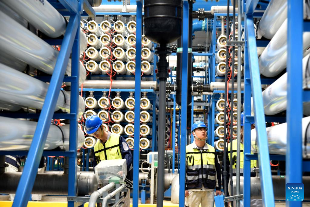Technicians check equipment at a seawater desalination plant in Qingdao, east China's Shandong Province, March 20, 2023. (Xinhua/Li Ziheng)