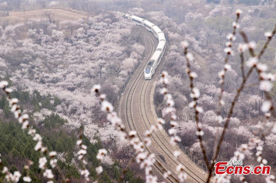 A suburban train runs through blooming flowers interspersed along the S2 line near Juyongguan Pass of the Great Wall in Beijing, March 21, 2023. (Photo: China News Service/Yi Haifei)