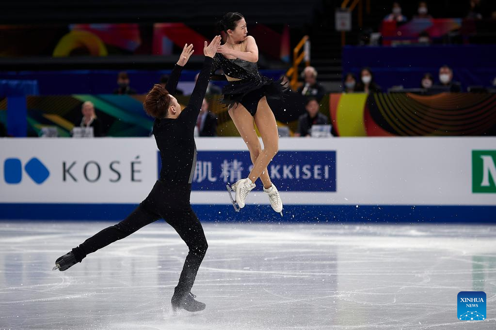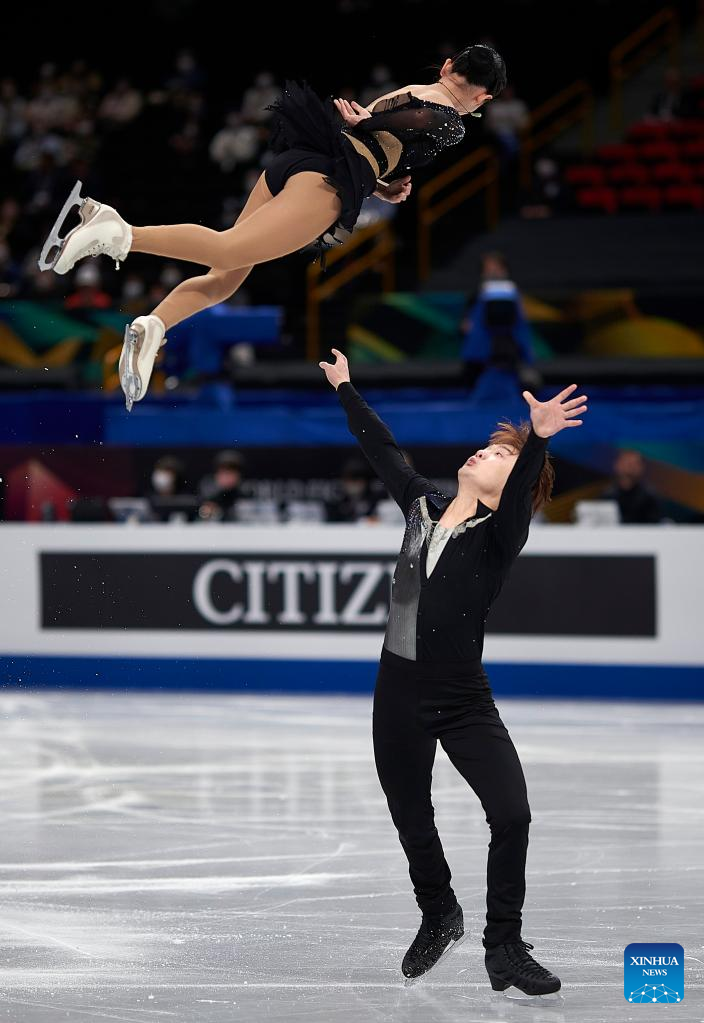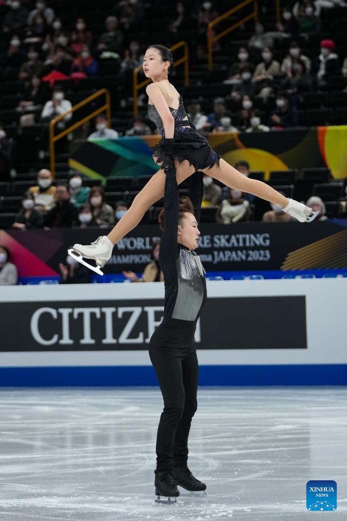 Zhang Siyang (top)/Yang Yongchao of China perform during the pairs short program at the ISU World Figure Skating Championships held at Saitama Super Area in Saitama, Japan, March 22, 2023. (Xinhua/Zhang Xiaoyu)