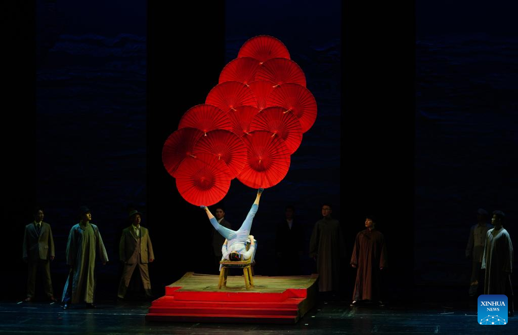Actors perform on stage at the Shandong Grand Theatre in Jinan, east China's Shandong Province, March 21, 2023. The 11th China Acrobatic Exhibition is held on March 16-29 in Jinan. This year's event features a series of acrobatic and magic shows as well as acrobatic dramas. (Xinhua/Xu Suhui)