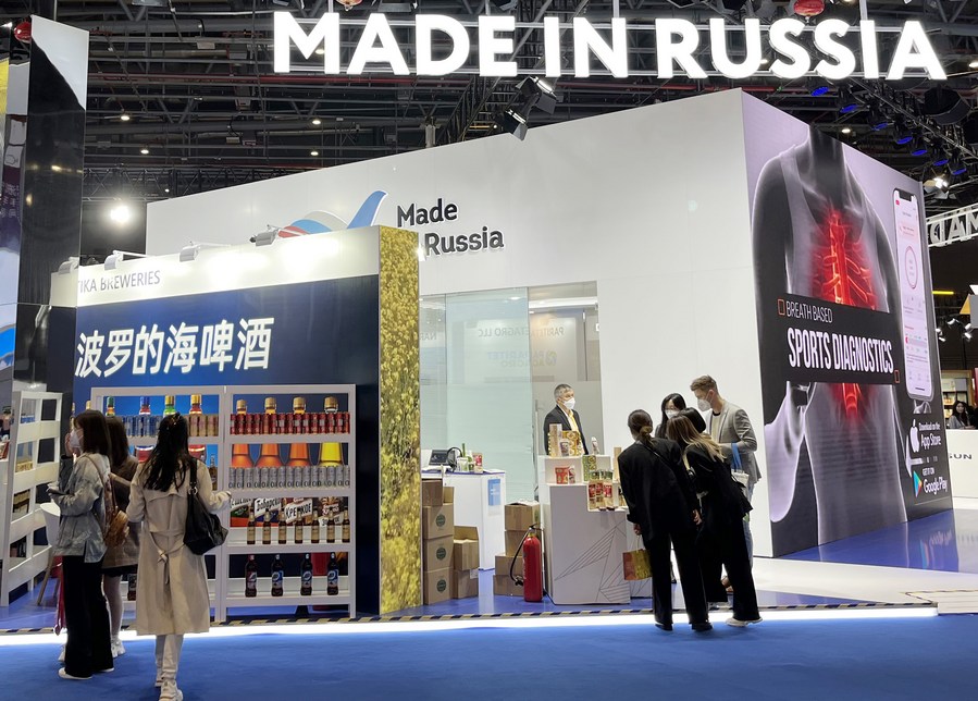 This photo taken on Nov. 6, 2022 shows the booth for products of Russia at the fifth China International Import Expo (CIIE) in east China's Shanghai. (Xinhua/Zheng Dongrui)