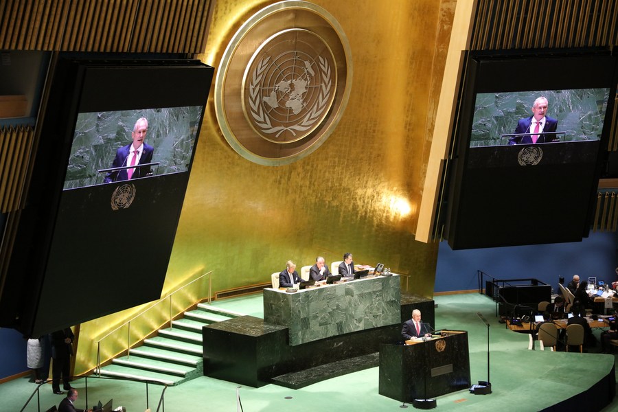 UN General Assembly President Csaba Korosi (at the podium and on screens) speaks at the opening session of the UN 2023 Water Conference at the UN headquarters in New York, on March 22, 2023. (Xinhua/Xie E)