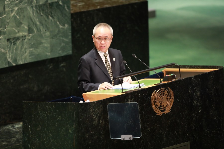 UN Under-Secretary-General for Economic and Social Affairs Li Junhua speaks at the opening session of the UN 2023 Water Conference at the UN headquarters in New York, on March 22, 2023. (Xinhua/Xie E)