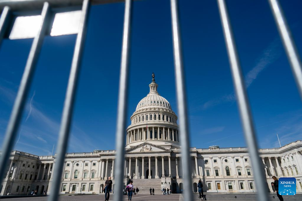 This photo taken on March 21, 2023 shows metal barricades placed near the Capitol building in Washington, D.C., the United States. (Xinhua/Liu Jie)