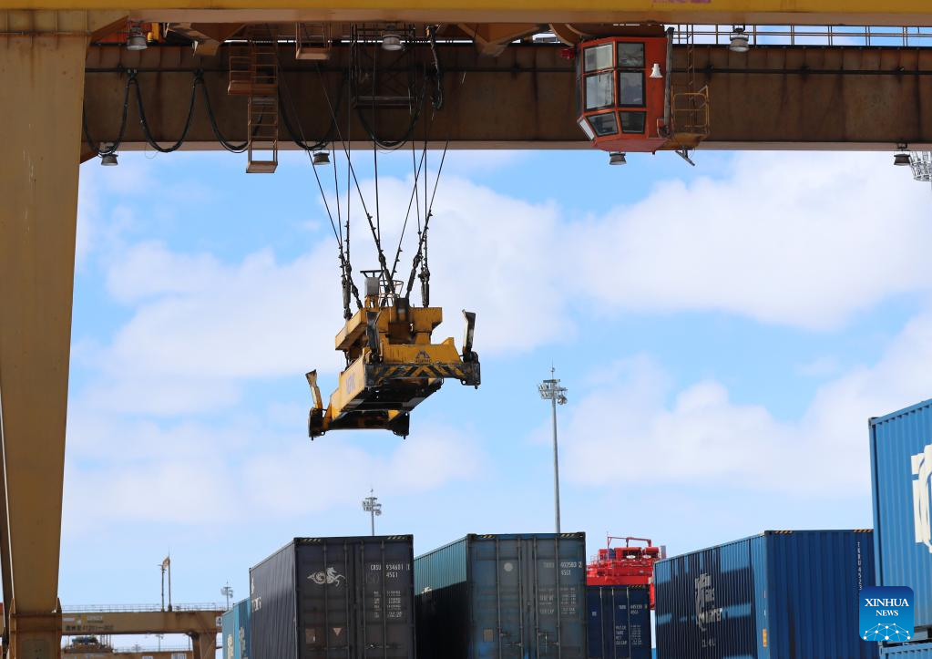A crane loads containers at the Manzhouli Railway Station in Manzhouli, north China's Inner Mongolia Autonomous Region, March 15, 2023. (Xinhua/Bei He)