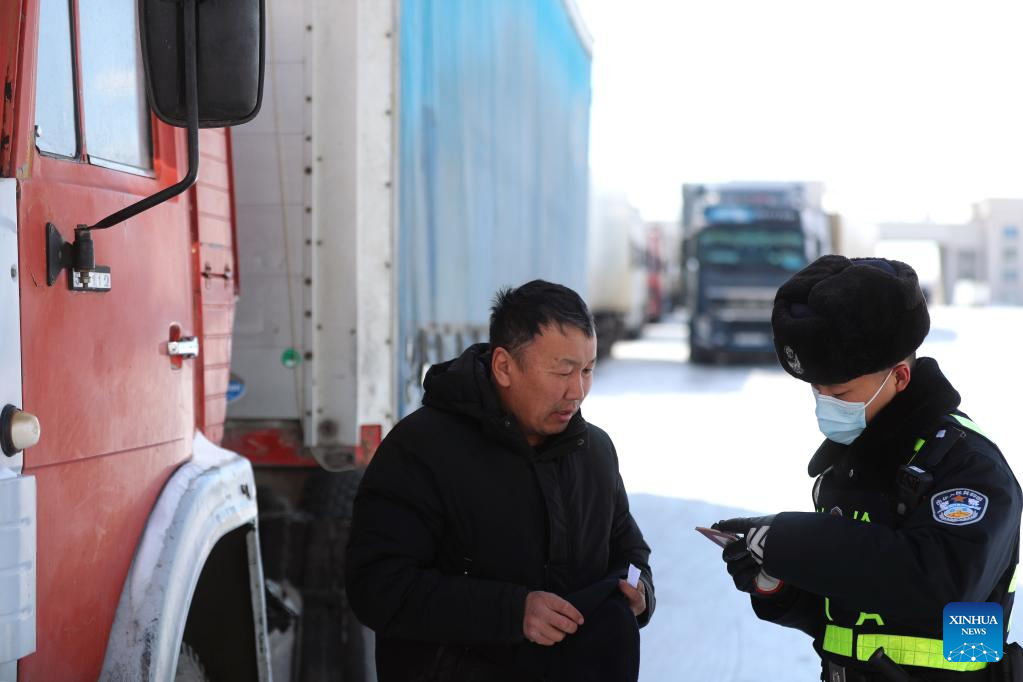 A police officer (R) checks credentials of a driver at the highway port in Manzhouli, north China's Inner Mongolia Autonomous Region, March 15, 2023. (Xinhua/Wang Kaiyan)