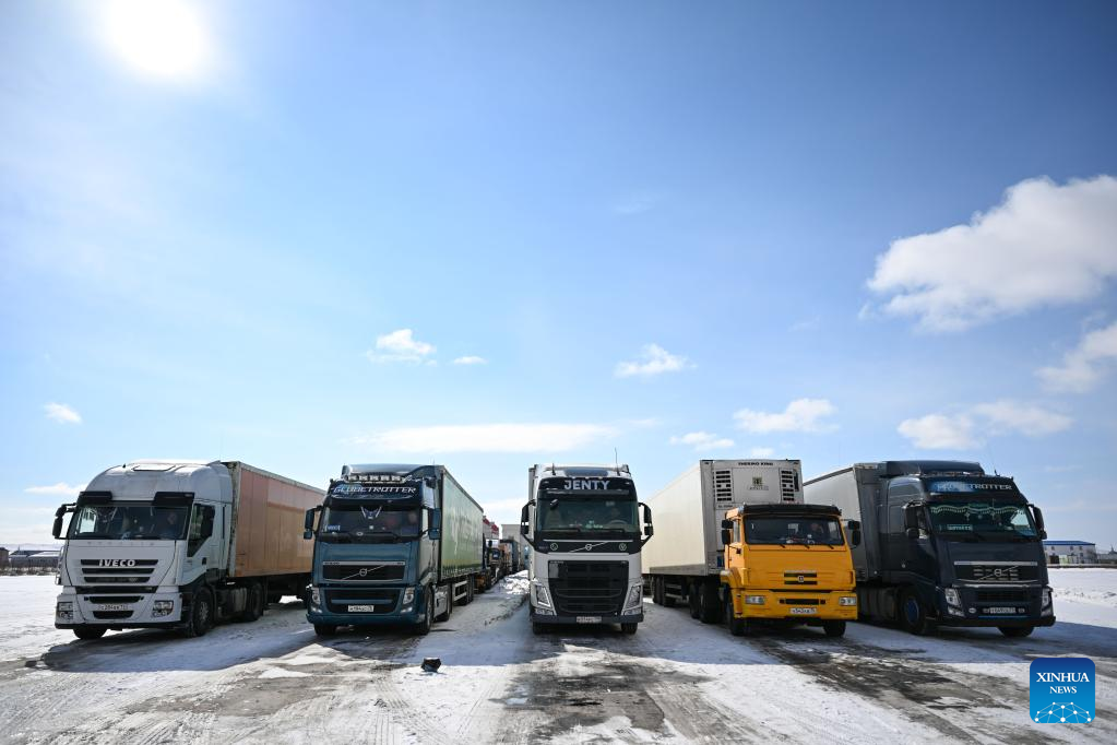 This photo taken on March 15, 2023 shows cargo trucks waiting to depart from the highway port in Manzhouli, north China's Inner Mongolia Autonomous Region. (Xinhua/Bei He)