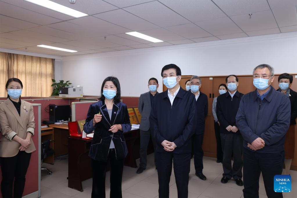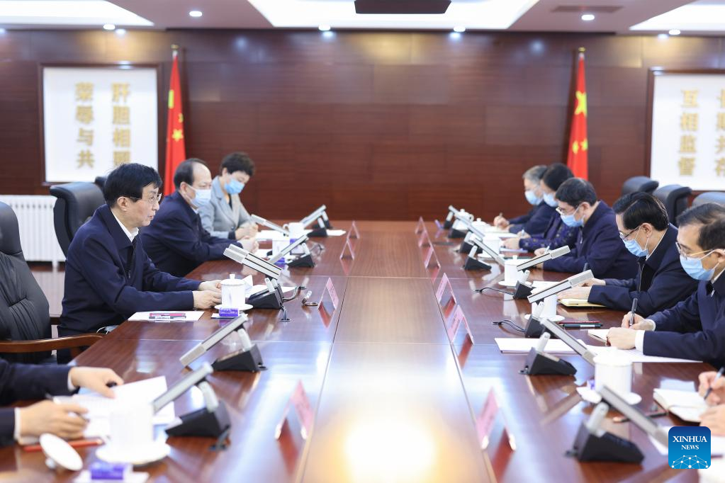 Wang Huning, a member of the Standing Committee of the Political Bureau of the Communist Party of China (CPC) Central Committee and chairman of the 14th National Committee of the Chinese People's Political Consultative Conference, visits the Central Committee of the Chinese Peasants and Workers Democratic Party (CPWDP) on March 21, 2023. Entrusted by Xi Jinping, general secretary of the CPC Central Committee, Wang recently made visits to the central committees of non-CPC parties and the All-China Federation of Industry and Commerce (ACFIC). (Xinhua/Liu Bin)