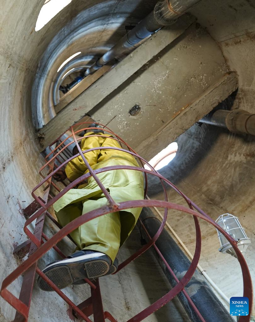 Mamadou Dieng climbs up a water tower to check and clean the water storage tank in Tenefoul Toucouleur Village, Diourbel, Senegal, March 20, 2023. (Xinhua/Han Xu)