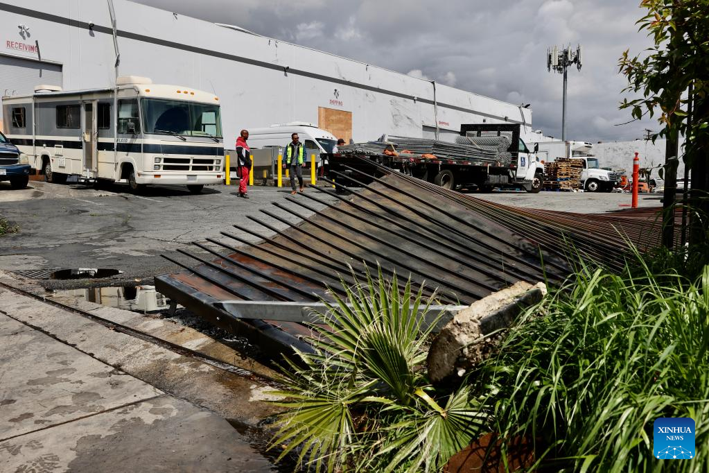 Photo taken on March 23, 2023 shows an iron fence damaged by a tornado in the city of Montebello, Los Angeles, the United States. Los Angeles area was hit by a rare tornado on Wednesday, the strongest one to impact LA Metro area since March 1983, according to the U.S. National Weather Service (NWS). (Xinhua)