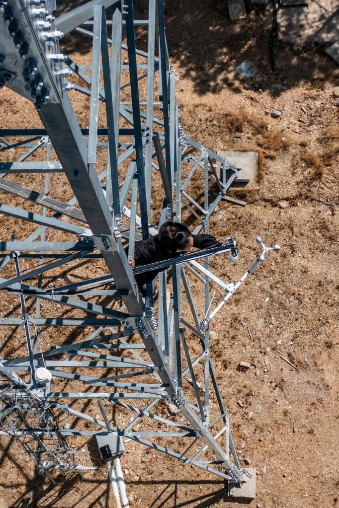 This aerial photo shows staff member Peng Xiaoqing working at Shangri-La National Atmospheric Background Station in the Deqen Tibetan Autonomous Prefecture of southwest China's Yunnan Province, on March 9, 2023. (Xinhua/Hu Chao)