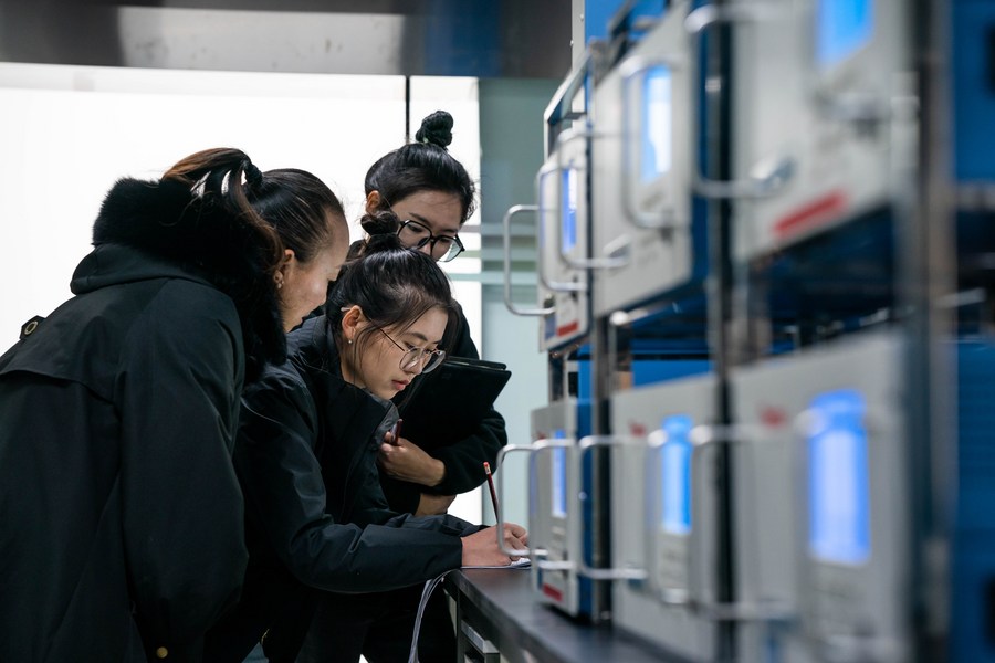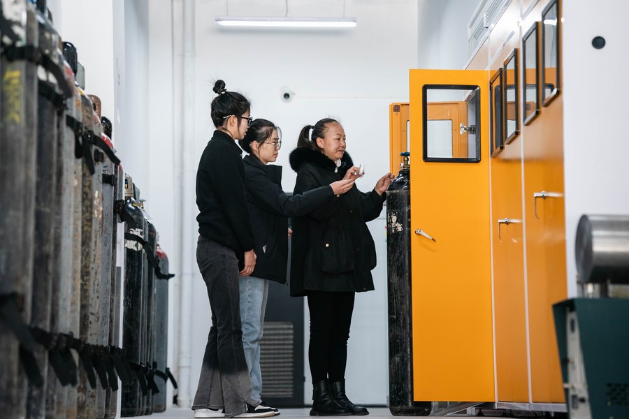 Staff members Yin Yuemiao (C), Peng Xiaoqing (L) and Li Xiaoli conduct inspection of reactive gases at Shangri-La National Atmospheric Background Station in the Deqen Tibetan Autonomous Prefecture of southwest China's Yunnan Province, on March 9, 2023. (Xinhua/Hu Chao)