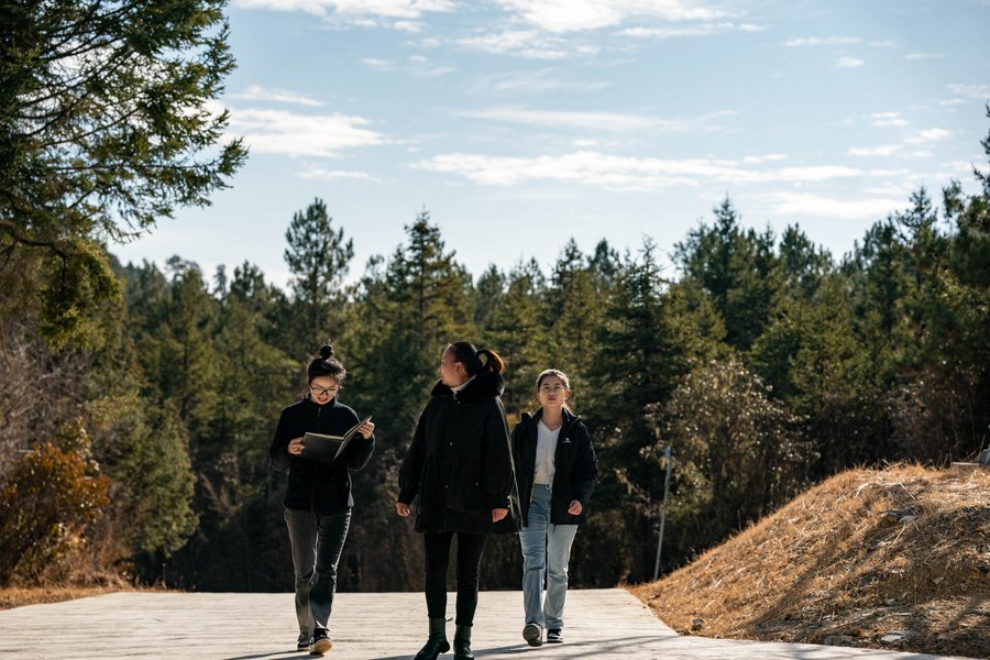 Staff members Yin Yuemiao (R), Peng Xiaoqing (C) and Li Xiaoli go to work at Shangri-La National Atmospheric Background Station in the Deqen Tibetan Autonomous Prefecture of southwest China's Yunnan Province, on March 9, 2023. (Xinhua/Hu Chao)