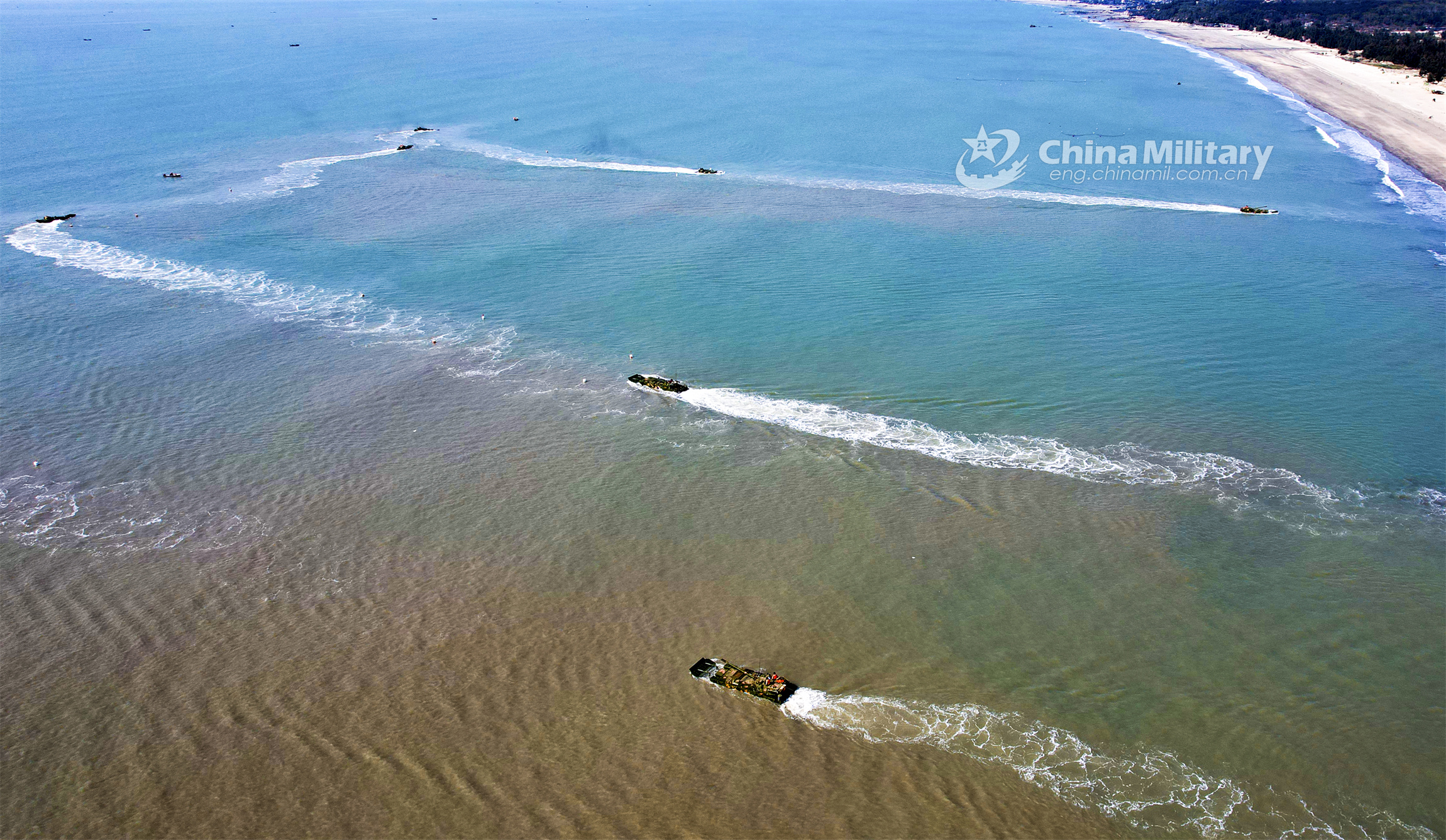 Amphibious armored vehicles attached to a brigade of the PLA 73rd Group Army make their way in formation during a maritime driving training exercise in mid-March, 2023. (eng.chinamil.com.cn/Photo by Fan Xiaoming)