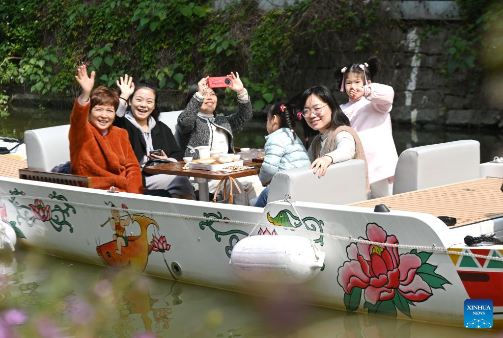 Tourists take a boat ride along the Baima River in Fuzhou, southeast China's Fujian Province, Feb. 25, 2023. (Xinhua/Lin Shanchuan)