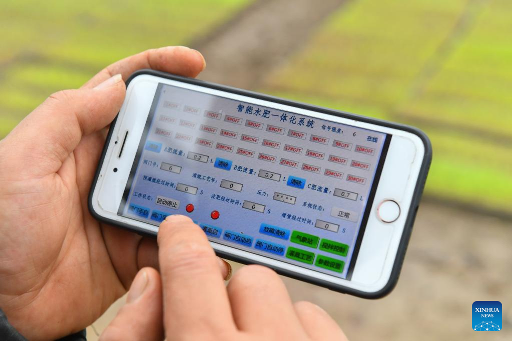 A farmer introduces 5G intelligent agricultural system in Yuhu District of Xiangtan City, central China's Hunan Province, March 23, 2023. (Xinhua/Chen Zeguo)