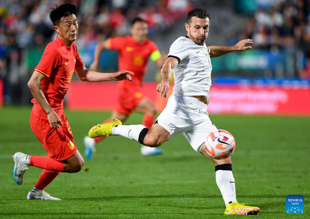 Wei Shihao of China controls the ball during an international freindly match between New Zealand and China in Auckland, New Zealand, March 23, 2023. (Xinhua/Guo Lei)