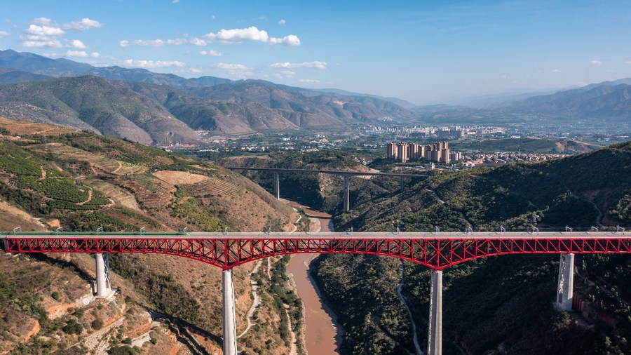 This aerial photo taken on Nov 23, 2022 shows a Fuxing bullet train running on the Yuanjiang bridge of the China-Laos Railway in southwest China's Yunnan Province. [Photo/Xinhua]