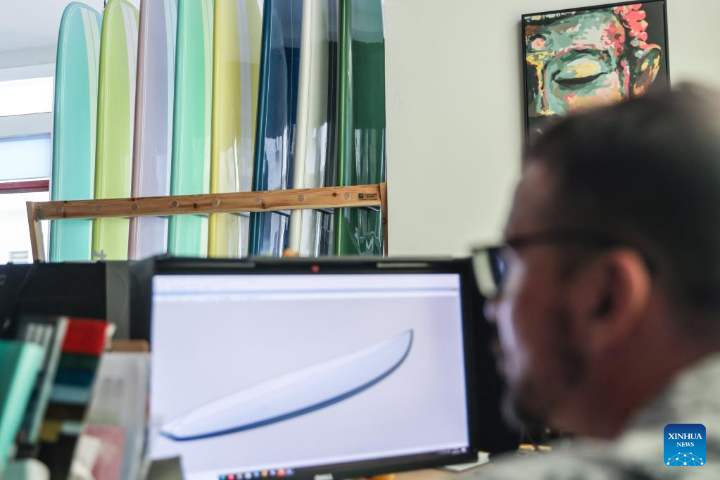 Alexander Pantyukhin designs a surfboard in his shop in Boao, south China's Hainan Province, March 18, 2023. (Xinhua/Zhang Liyun)