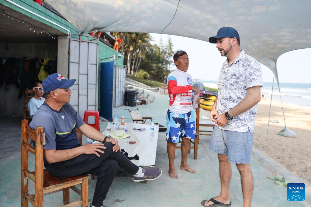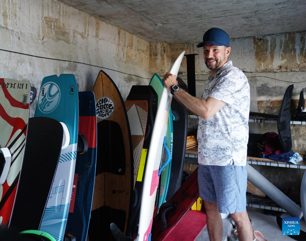 Alexander Pantyukhin shows his surfboard in Boao, south China's Hainan Province, March 18, 2023. (Xinhua/Fan Yuqing)