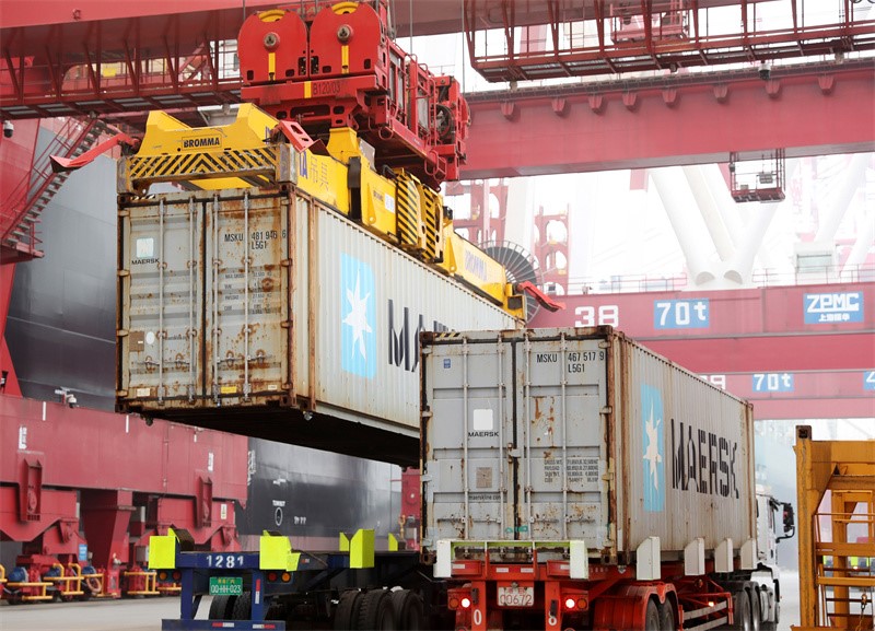 MSC Irina, the world’s largest mega container vessel, is loaded at a container terminal in the Qingdao Port, east China’s Shandong Province, on March 23, 2023. (Photo/Zhang Jingang)