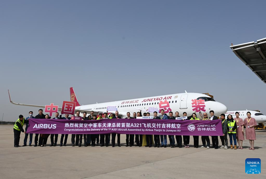 Staff members of European aircraft manufacturer Airbus and Shanghai-based Juneyao Air, who attend the delivery ceremony of the first China-assembled A321neo aircraft, pose for a group photo in front of the aircraft in north China's Tianjin on March 24, 2023. (Xinhua/Zhao Zishuo)