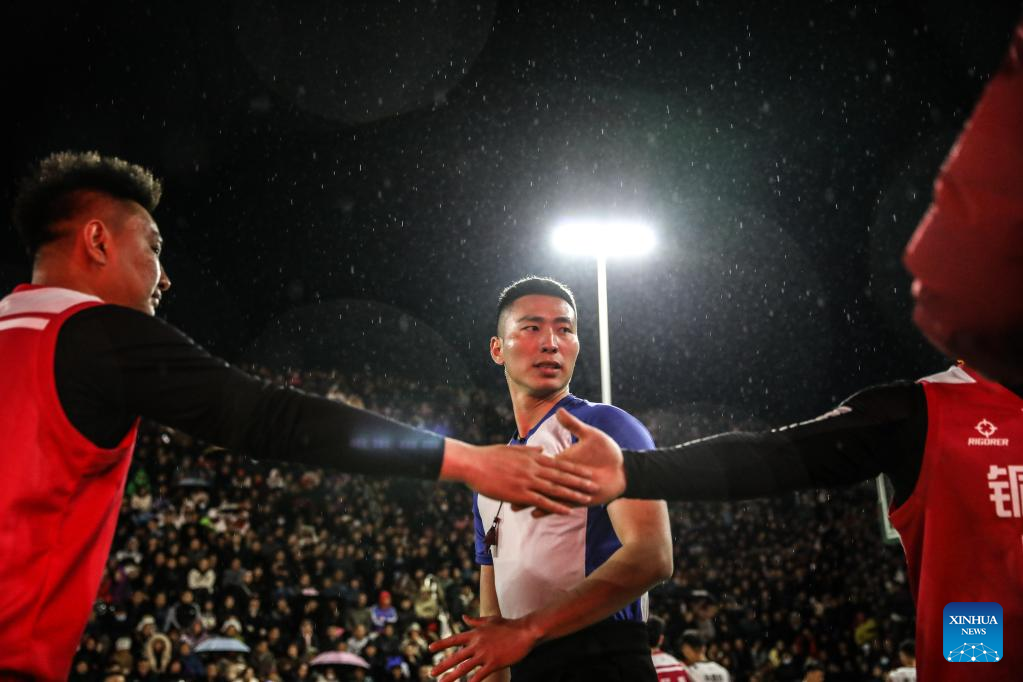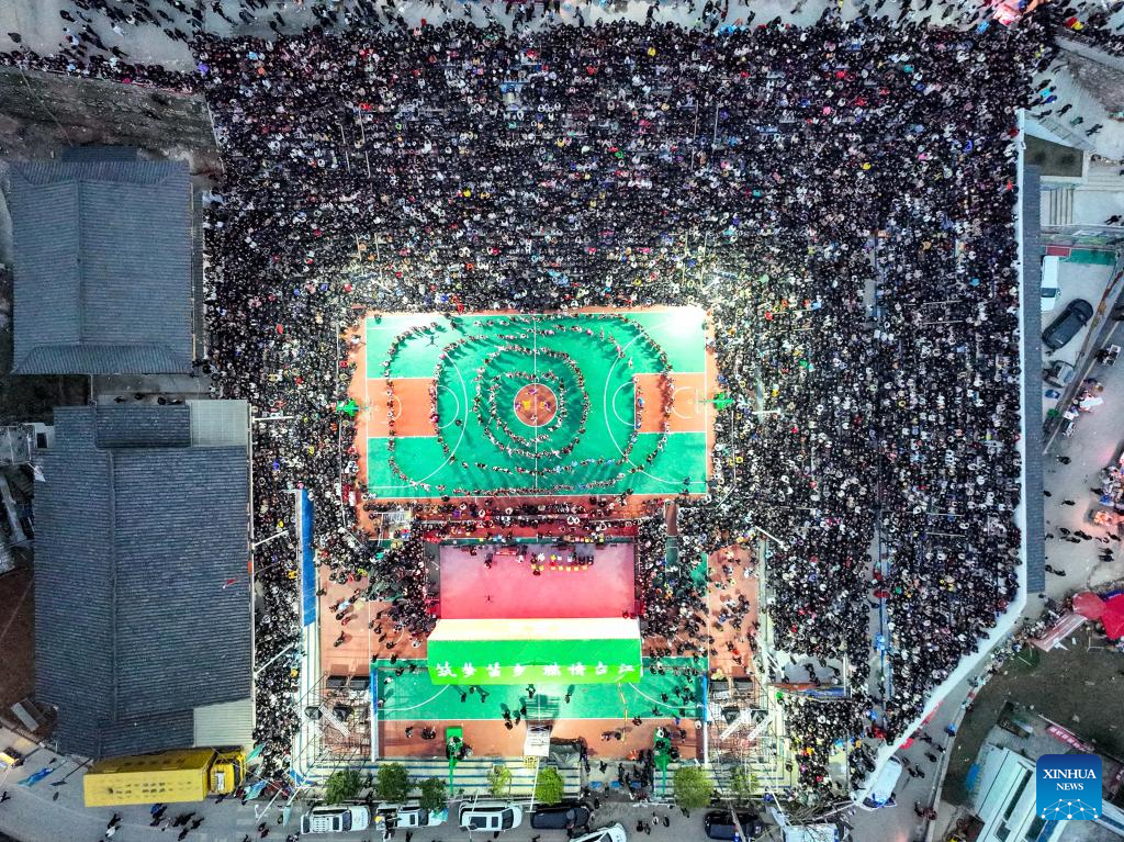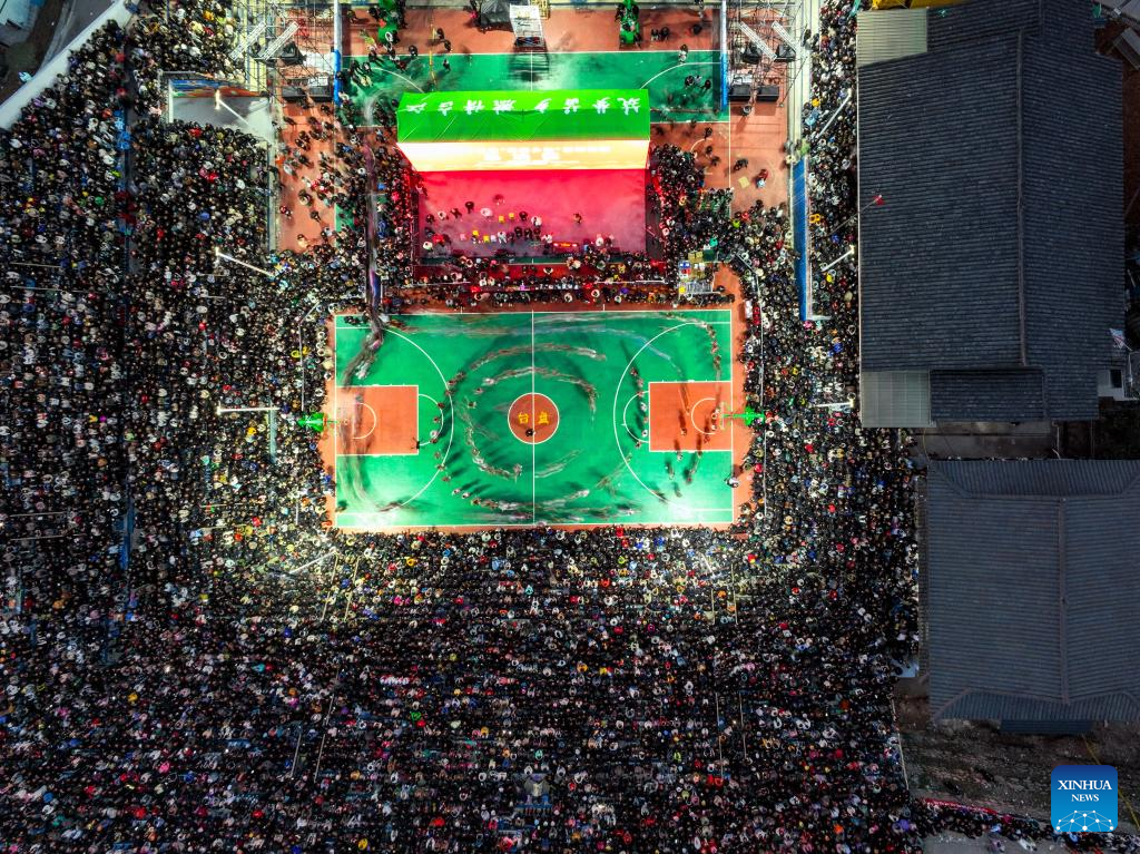 Artists dance prior to a basketball game between Team Tongren and Team Qiandongnan held in Taipan Village, Taijiang County, southwest China's Guizhou Province, March 25, 2023. "Village Basketball Association" or "Village BA", is a grassroot basketball tournament held in Taipan Village. Organized by local residents, this event has gained popularity over the years and draws a large crowd of spectators and participants alike. The tournament showcases the passion and skills of basketball players from rural areas, as they compete and demonstrate their teamwork on the court. (Xinhua/Liu Xu)
