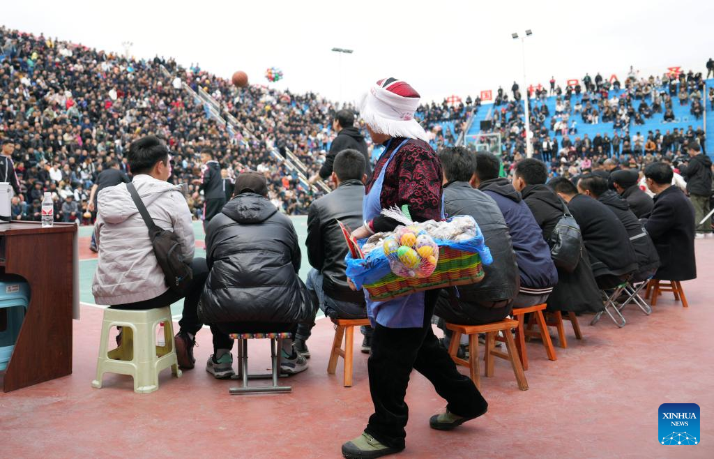 A villager sells local product prior to a basketball game between Team Tongren and Team Qiandongnan held in Taipan Village, Taijiang County, southwest China's Guizhou Province, March 25, 2023. "Village Basketball Association" or "Village BA", is a grassroot basketball tournament held in Taipan Village. Organized by local residents, this event has gained popularity over the years and draws a large crowd of spectators and participants alike. The tournament showcases the passion and skills of basketball players from rural areas, as they compete and demonstrate their teamwork on the court. (Xinhua/Li Ga)