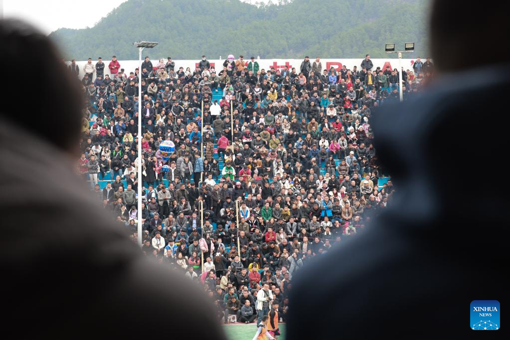 Villagers gather prior to a basketball game between Team Tongren and Team Qiandongnan held in Taipan Village, Taijiang County, southwest China's Guizhou Province, March 25, 2023. "Village Basketball Association" or "Village BA", is a grassroot basketball tournament held in Taipan Village. Organized by local residents, this event has gained popularity over the years and draws a large crowd of spectators and participants alike. The tournament showcases the passion and skills of basketball players from rural areas, as they compete and demonstrate their teamwork on the court. (Xinhua/Li Ga)