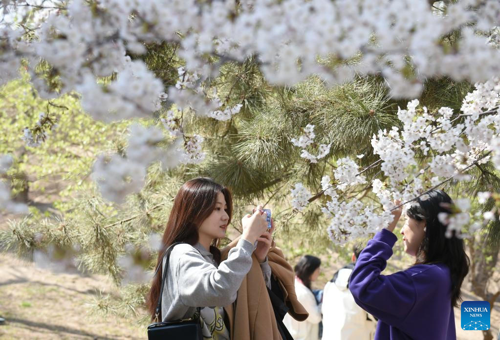 Visitors take pictures of flowers at Yuyuantan Park in Beijing, capital of China, March 26, 2023. As the weather gets warm, blossoms are in full bloom at Yuyuantan Park. (Xinhua/Luo Xiaoguang)