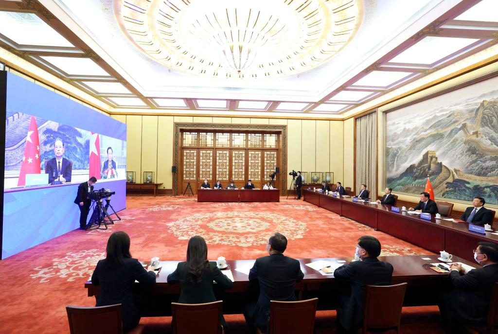 Zhao Leji, a member of the Standing Committee of the Political Bureau of the Communist Party of China (CPC) Central Committee and chairman of the National People's Congress (NPC) Standing Committee, holds talks with Vietnam's National Assembly chairman Vuong Dinh Hue via video link at the Great Hall of the People in Beijing, capital of China, March 27, 2023. (Xinhua/Liu Weibing)