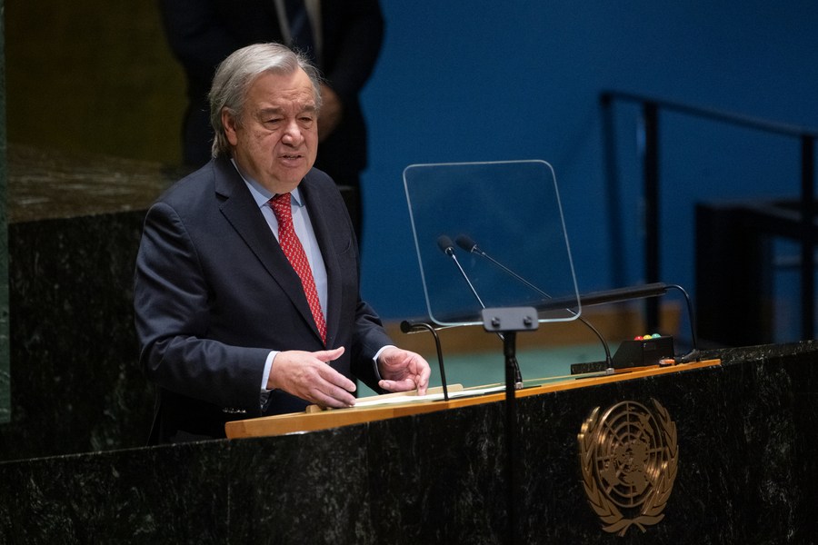 UN Secretary-General Antonio Guterres addresses a UN General Assembly event marking the International Day of Remembrance of the Victims of Slavery and the Transatlantic Slave Trade at the UN headquarters in New York, on March 27, 2023. (Eskinder Debebe/UN Photo/Handout via Xinhua)