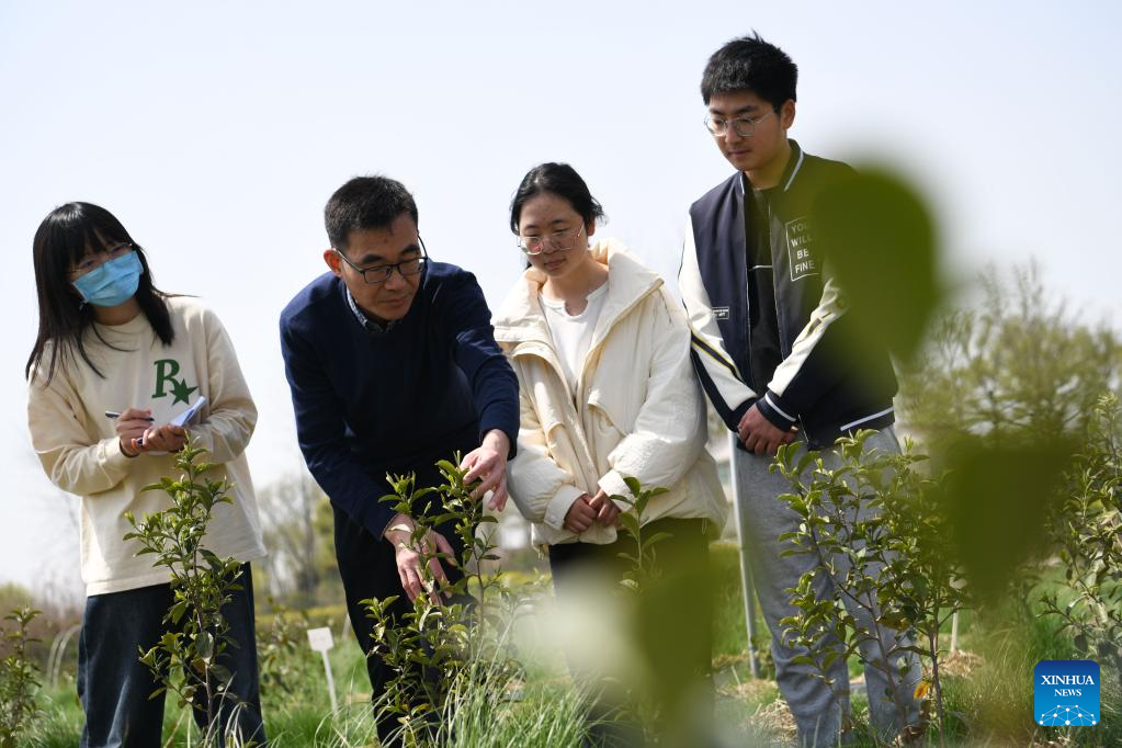 Wei Chaoling (2nd L), executive deputy director of State Key Laboratory of Tea Plant Biology and Utilization of Anhui Agricultural University teaches the knowledge about the breeding of new varieties of tea plant to the students at an agricultural experimental base in Hefei, east China's Anhui Province, March 26, 2023. As spring has come, students of Anhui Agricultural University have been studying and practicing at the university's agricultural experimental base. (Xinhua/Zhang Duan)