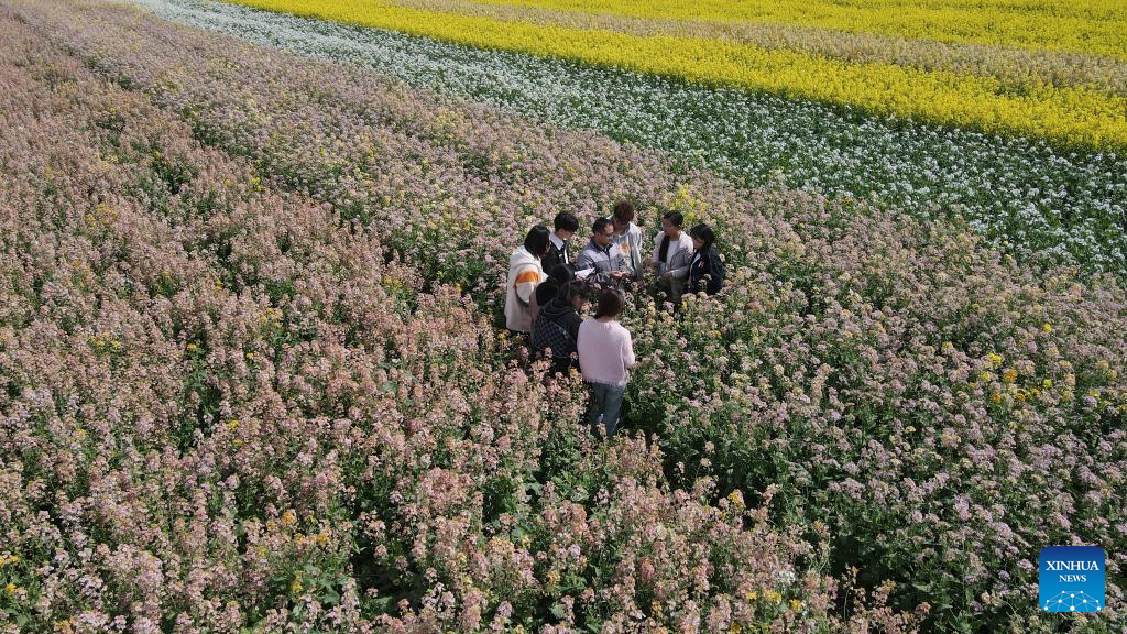 Zhang Fugui (4th R), teacher of Anhui Agricultural University, teaches the knowledge about the development and utilization of cole to the students at an agricultural experimental base in Hefei, east China's Anhui Province, March 26, 2023. As spring has come, students of Anhui Agricultural University have been studying and practicing at the university's agricultural experimental base. (Xinhua/Zhang Duan)