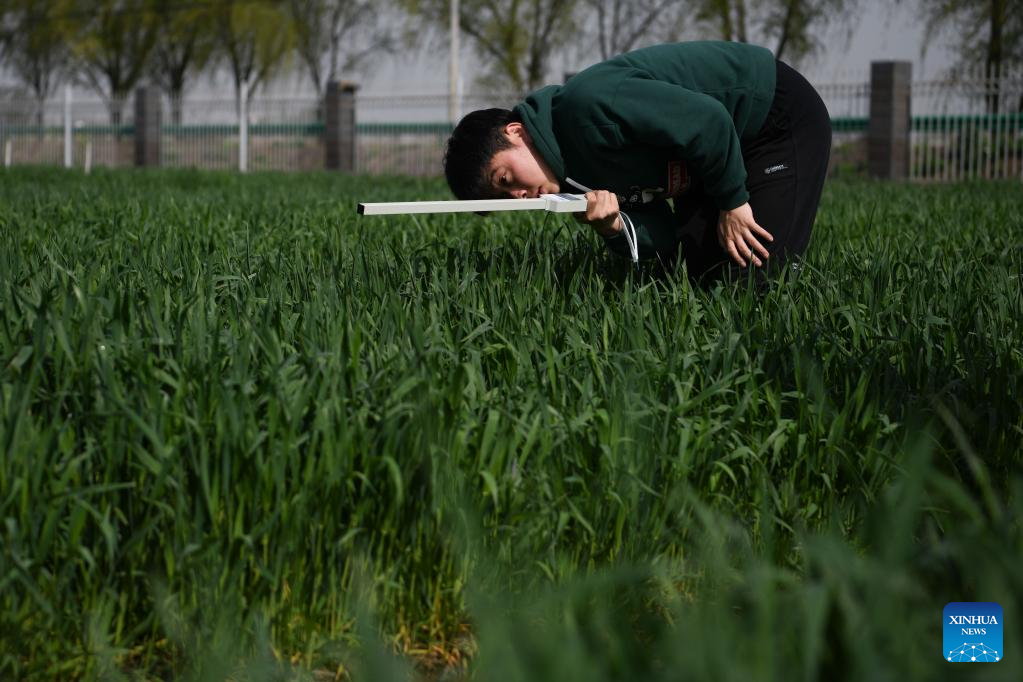 A student of Anhui Agricultural University measures wheat canopy at an agricultural experimental base in Hefei, east China's Anhui Province, March 26, 2023. As spring has come, students of Anhui Agricultural University have been studying and practicing at the university's agricultural experimental base. (Xinhua/Zhang Duan)