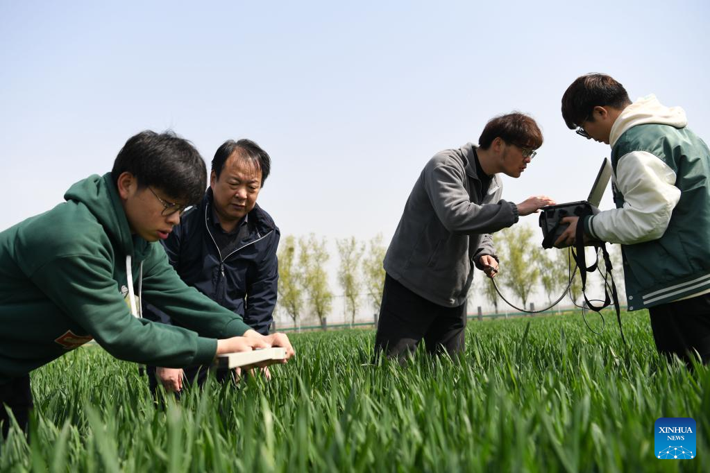 Huang Zhenglai (2nd L), vice president of new rural development institute of Anhui Agricultural University teaches students measure wheat canopy at an agricultural experimental base in Hefei, east China's Anhui Province, March 26, 2023. As spring has come, students of Anhui Agricultural University have been studying and practicing at the university's agricultural experimental base. (Xinhua/Zhang Duan)