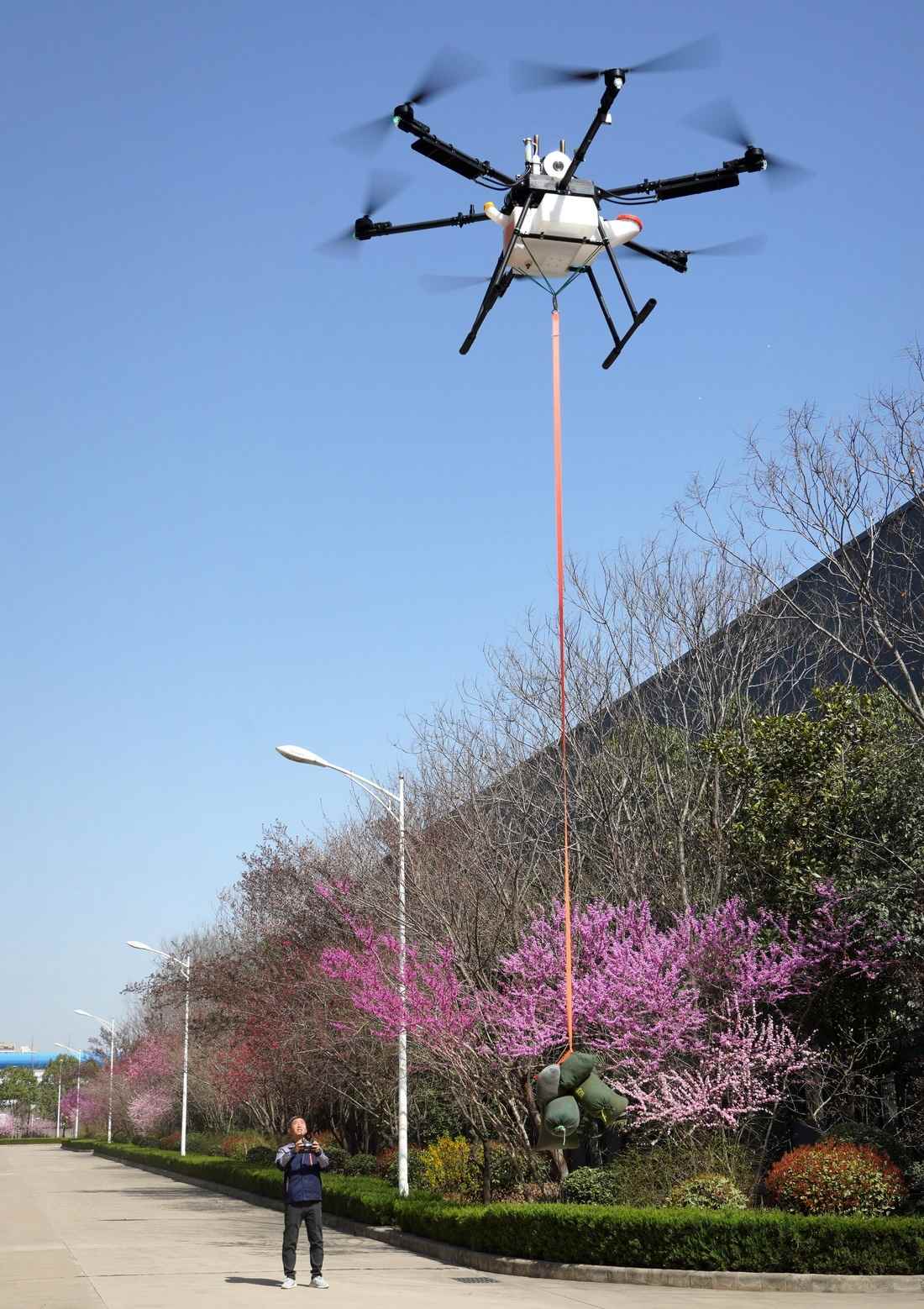 Yang Shiyi tests the load capacity of his drone model in Luoyang city, central China’s Henan Province, on March 14, 2023. (Photo/Xinhua)