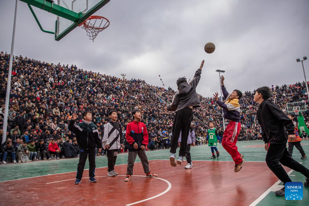 Kids play basketball in Taipan village, Taijiang county, Southwest China's Guizhou province, March 25, 2023. "Village Basketball Association" or "Village BA", is a grassroot basketball tournament held in Taipan village. Organized by local residents, this event has gained popularity over the years and draws a large crowd of spectators and participants alike. The tournament showcases the passion and skills of basketball players from rural areas, as they compete and demonstrate their teamwork on the court. [Photo/Xinhua]
