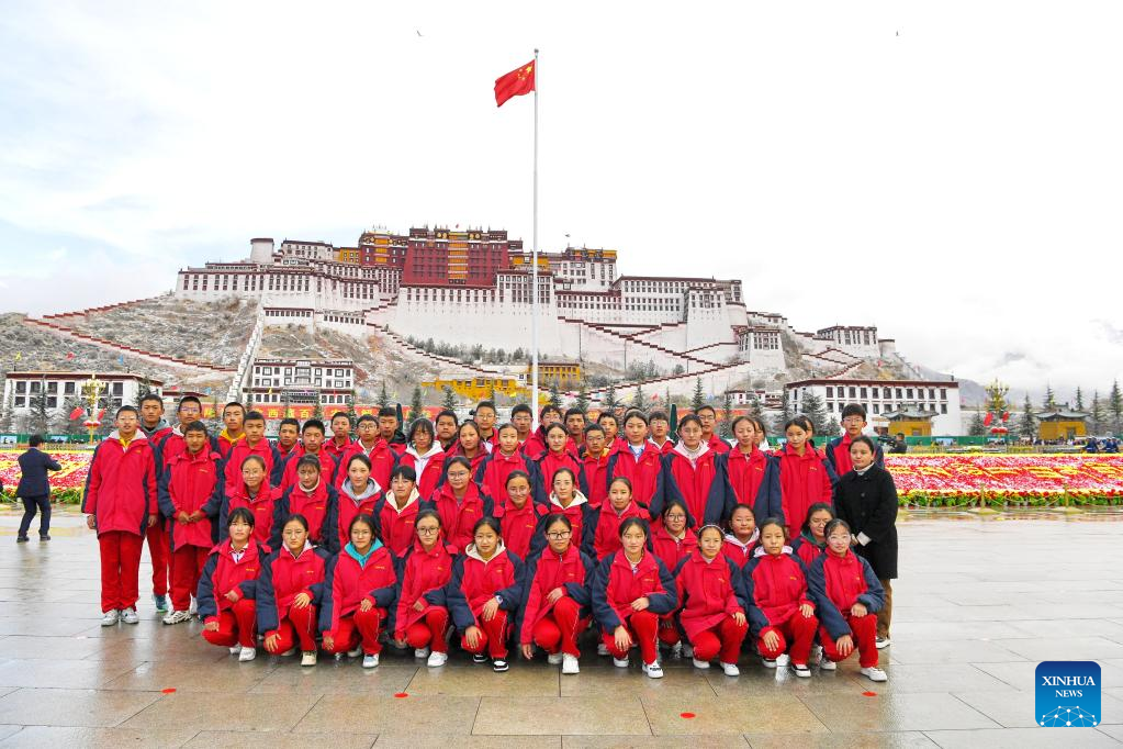 Students pose for a group photo after a national flag raising ceremony marking the 15th Serfs' Emancipation Day at a square in front of the Potala Palace in Lhasa, capital of southwest China's Tibet Autonomous Region, March 28, 2023. The 15th Serfs' Emancipation Day falls on Tuesday. (Xinhua/Zhang Rufeng)