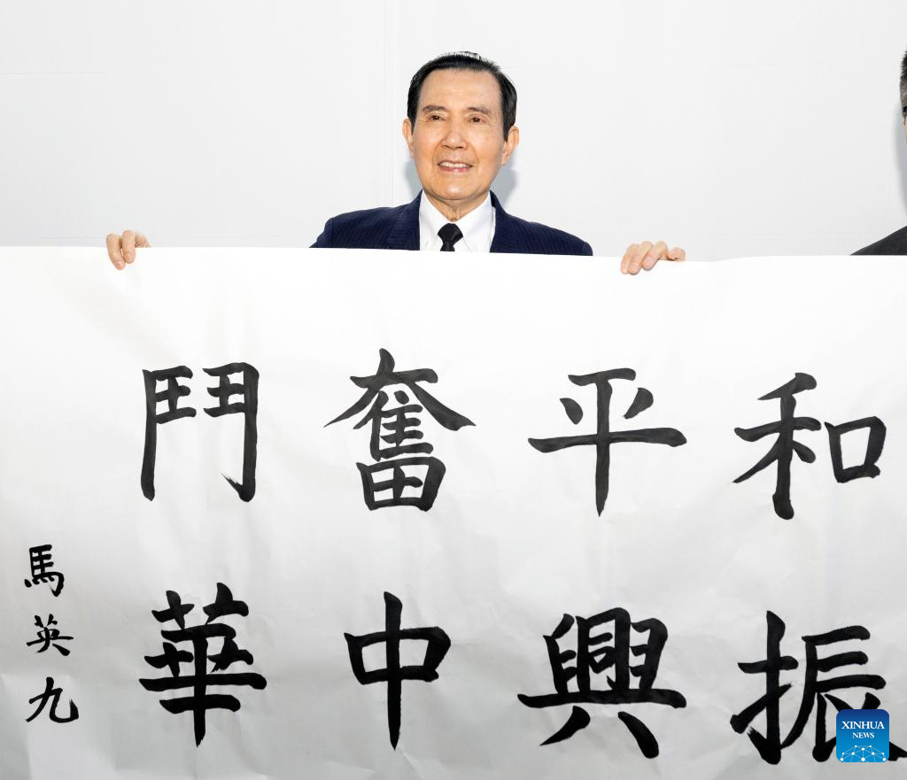 Ma Ying-jeou, former chairman of the Chinese Kuomintang party, writes an inscription meaning "Peace, endeavor, revitalizing China" in commemoration at the Sun Yat-sen Mausoleum in Nanjing, east China's Jiangsu Province, March 28, 2023. A delegation led by Ma visited the Sun Yat-sen Mausoleum in Nanjing Tuesday morning. (Xinhua/Cai Yang)