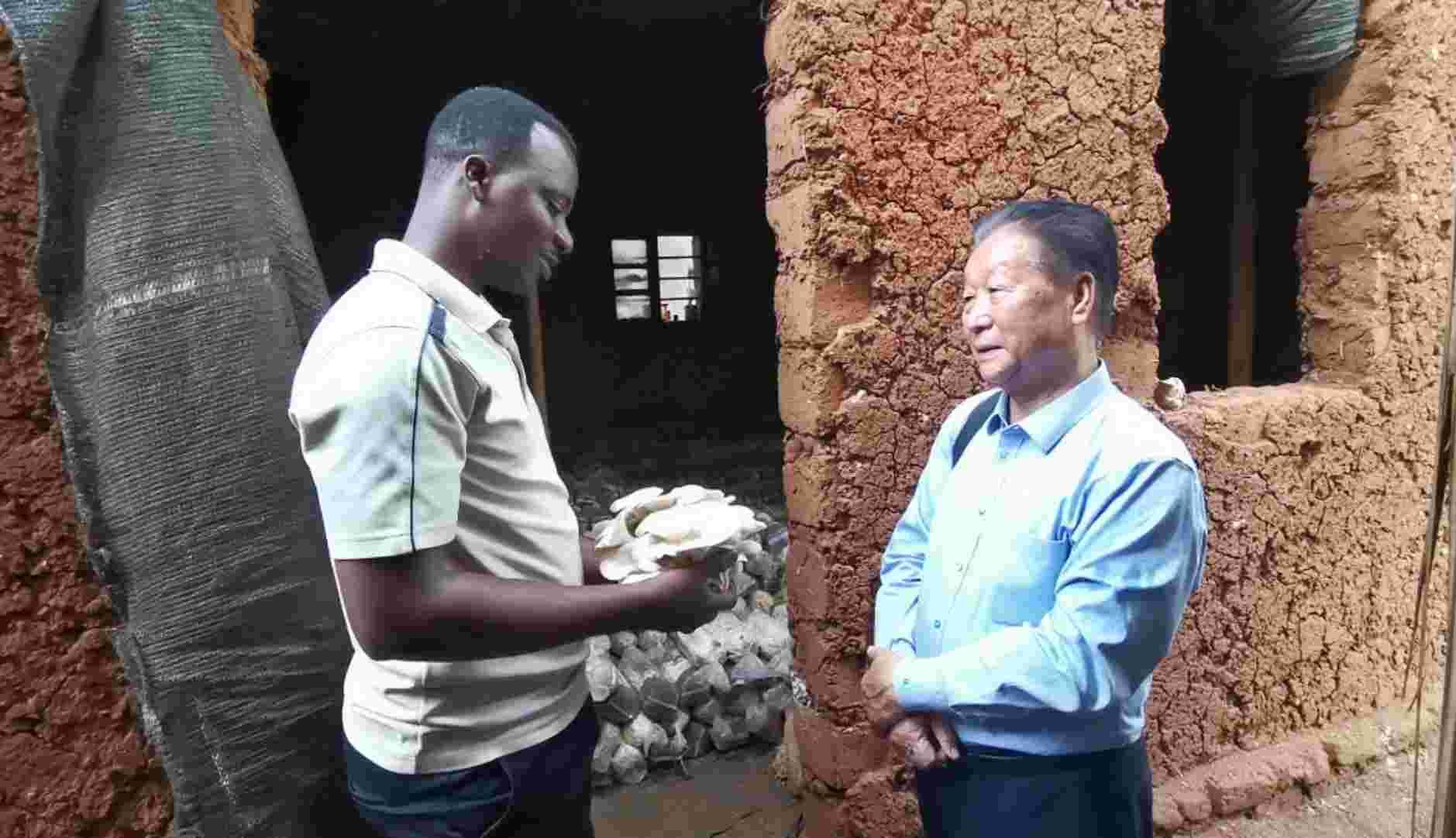 A photo took in 2019 shows Lin Zhanxi, who invented the Juncao Technology, instructs a local farmer in Rwanda to grow fungi. (Photo provided by Lin Zhanxi)